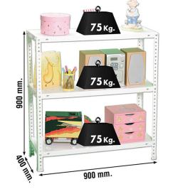 Estantería metálica con tornillos de color BLANCO con capacidad de carga por estante de 75 kg. El número de estantes es 3 y las medidas (alto x ancho x fondo) son 900x900x400 mm. Producto español, calidad europea, podrás encontrar las intrucciones de montaje en su interior o en este enlace: https://www.youtube.com/watch?v=4HO6NqZuG-s. Medidas en uso del producto: 900x910x410 mm