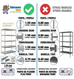 Estantería metálica sin tornillos de color GALVA/GALVA con capacidad de carga por estante de 300 kg. El número de estantes es 5 y las medidas (alto x ancho x fondo) son 2000x1200x600 mm. Incluye bandejas de metal. Producto español, calidad europea, podrás encontrar las intrucciones de montaje en su interior. Medidas en uso del producto: 1975x1210x610 mm