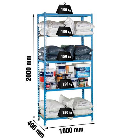 Estantería metálica sin tornillos de color AZUL/MADERA con capacidad de carga por estante de 150 kg. El número de estantes es 5 y las medidas (alto x ancho x fondo) son 2000x1000x400 mm. Tiene estantes de aglomerado de 12 mm. Producto español de calidad europea, podrás encontrar las intrucciones de montaje en su interior o en este enlace: https://www.youtube.com/watch?v=J8R6iEhkKA0&t=3s. Medidas en uso del producto: 1975x1100x410 mm