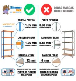 Estantería metálica sin tornillos de color AZUL/NARANJA/MADERA con capacidad de carga por estante de 150 kg. El número de estantes es 5 y las medidas (alto x ancho x fondo) son 2000x1000x500 mm. Tiene estantes de aglomerado de 12 mm. Producto español de calidad europea, podrás encontrar las intrucciones de montaje en su interior o en este enlace: https://www.youtube.com/watch?v=J8R6iEhkKA0&t=3s. Medidas en uso del producto: 1975x1100x510 mm