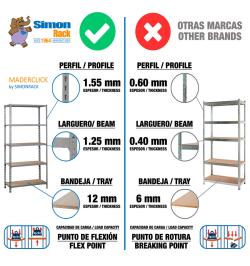 Estantería metálica sin tornillos de color GRIS/MADERA con capacidad de carga por estante de 150 kg. El número de estantes es 5 y las medidas (alto x ancho x fondo) son 1800x800x400 mm. Tiene estantes de aglomerado de 12 mm. Producto español de calidad europea, podrás encontrar las intrucciones de montaje en su interior o en este enlace: https://www.youtube.com/watch?v=J8R6iEhkKA0&t=3s. Medidas en uso del producto: 1787x810x410 mm
