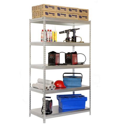 Estantería metálica sin tornillos de color GALVA/GALVA con capacidad de carga por estante de 300 kg. El número de estantes es 5 y las medidas (alto x ancho x fondo) son 2000x1000x600 mm. Incluye bandejas de metal. Producto español, calidad europea, podrás encontrar las intrucciones de montaje en su interior. Medidas en uso del producto: 1975x1100x610 mm