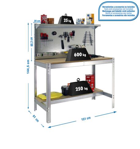 Banco de trabajo metálico de color GALVA/MADERA con capacidad de carga de 600 kg. Las medidas (alto x ancho x fondo) son 1445x1510x610 mm. Producto español, calidad europea, podrás encontrar las intrucciones de montaje en su interior o en este enlace: https://www.youtube.com/watch?v=4vv38d3Jns0. Medidas en uso del producto: 1445x1510x610 mm